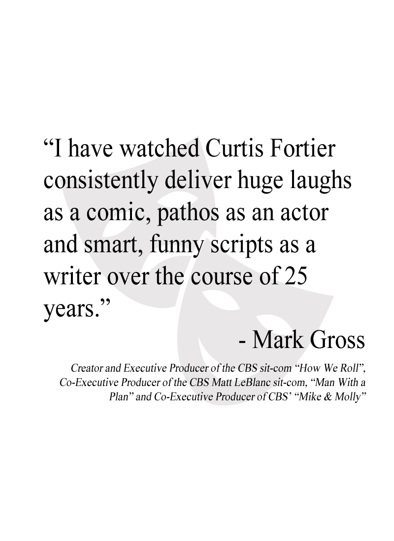 A ctor and stand-up comedian Curtis Fortier was born and raised in Grand Rapids, Michigan where he honed his comedy chops amidst a large Irish Catholic family that included two brothers, a sister and more than 30 cousins. After 12 years of Catholic school Curtis went onto perform with The Calumet Players and then The Troupe improv group at his alma mater Michigan Tech where he received his Masters Degree in Mechanical Engineering having done his thesis on the space shuttle.